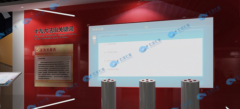 海南法制宣传展厅设备主要采用现代化数字多媒体互动设备:其中包括、电子翻书、电子竞赛抢答系统、9D技术、电子签名拍照系统、3D演示、意念拒毒、触控一体机、VR体验等众多声光电现代化媒体技术,结合实物陈列,以图文、漫画、互动等形式,向广重庆人民特别是青少年宣传法律知识,切实发挥出基地寓教于乐、润物无声的教育作用。